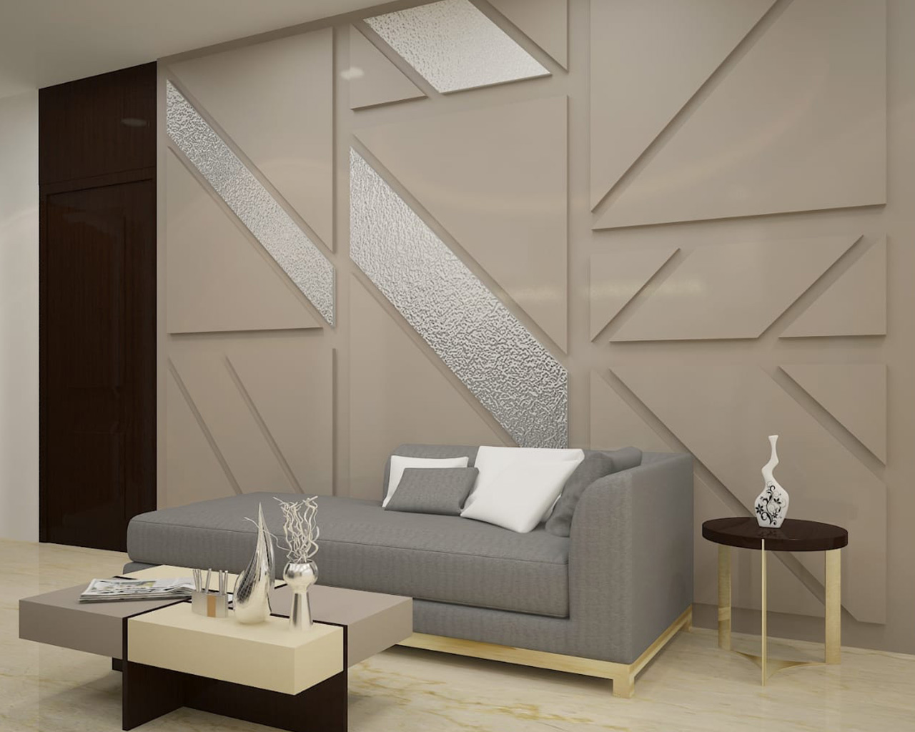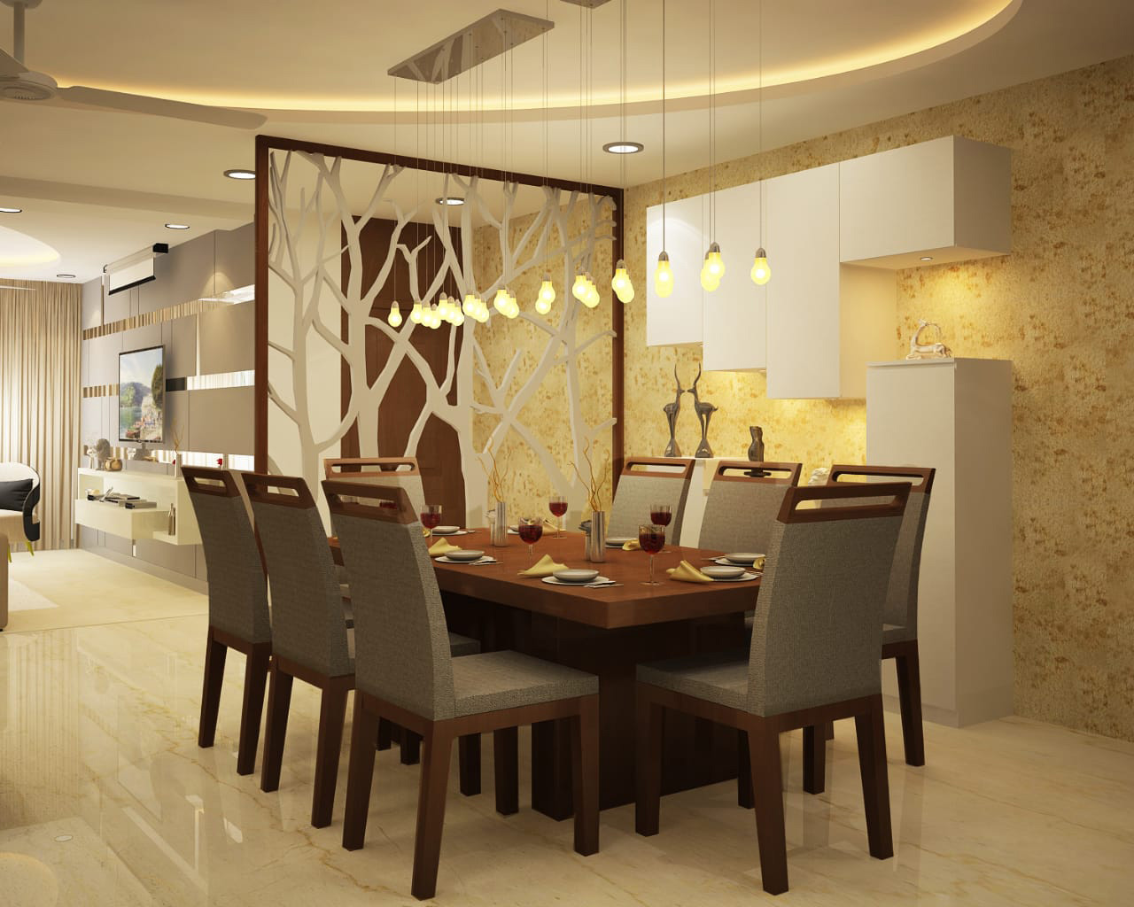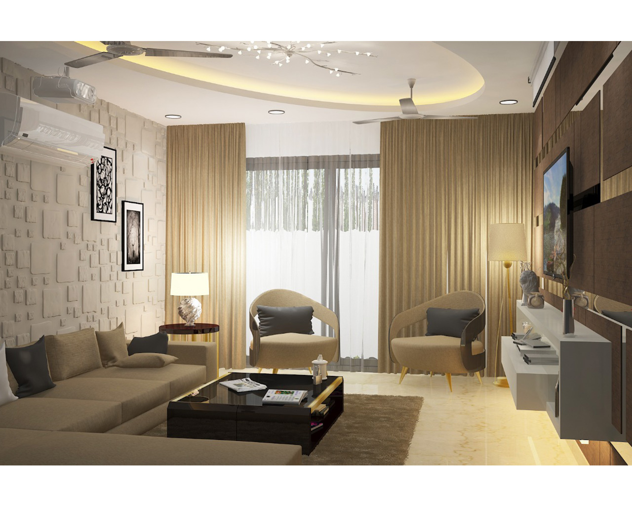 In this project of Chandigarh the Customer wanted his house to be the epitome of luxury and elegance. A luxurious living room interior was designed with oval shape ceiling which adds to the aesthetics of the room. The TV wall had fabric panels which not only enhance the aesthetic appeal but also improve the room's acoustics by dampening noise, as demanded by our Client.