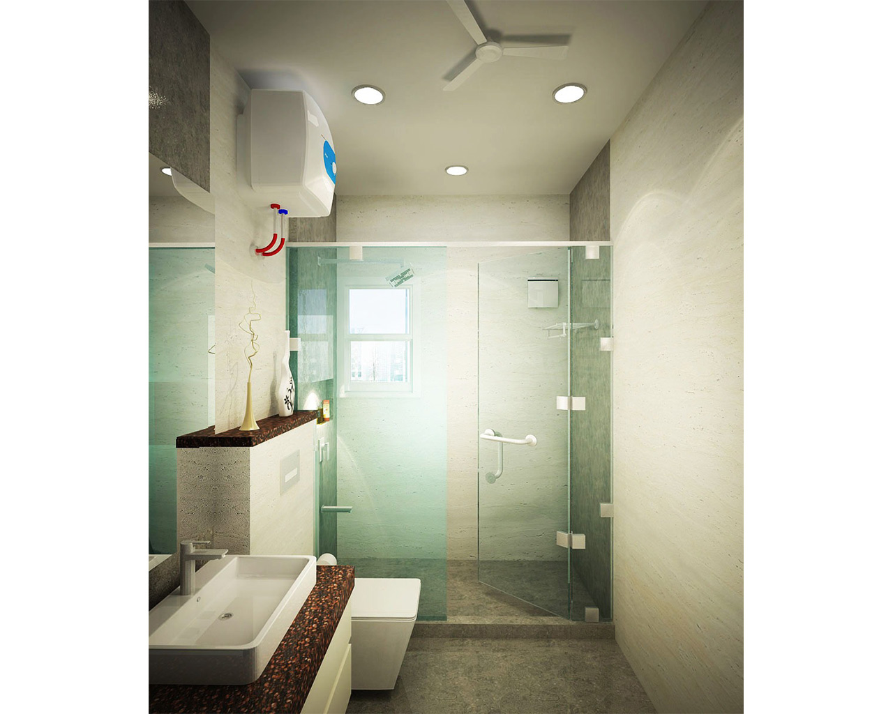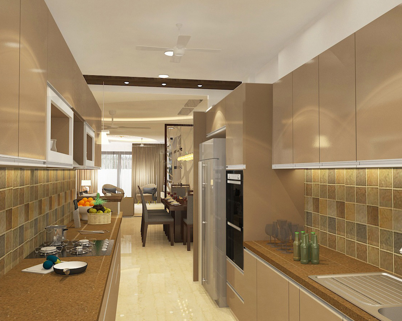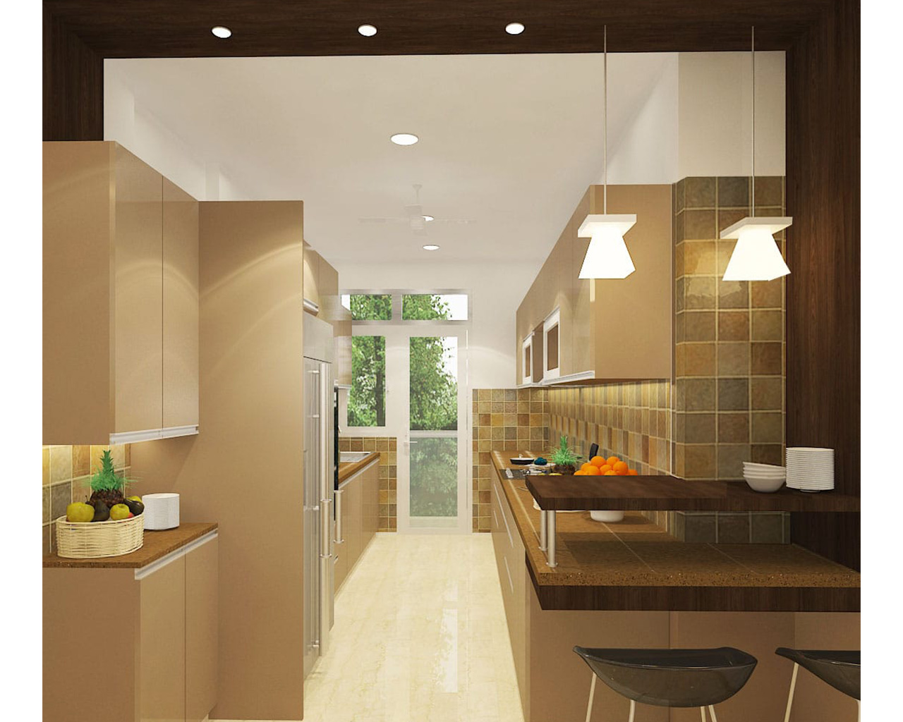 The Parallel kitchen had Laminate finish cabinets, with nude colour scheme. We designed a small breakfast counter in the kitchen.